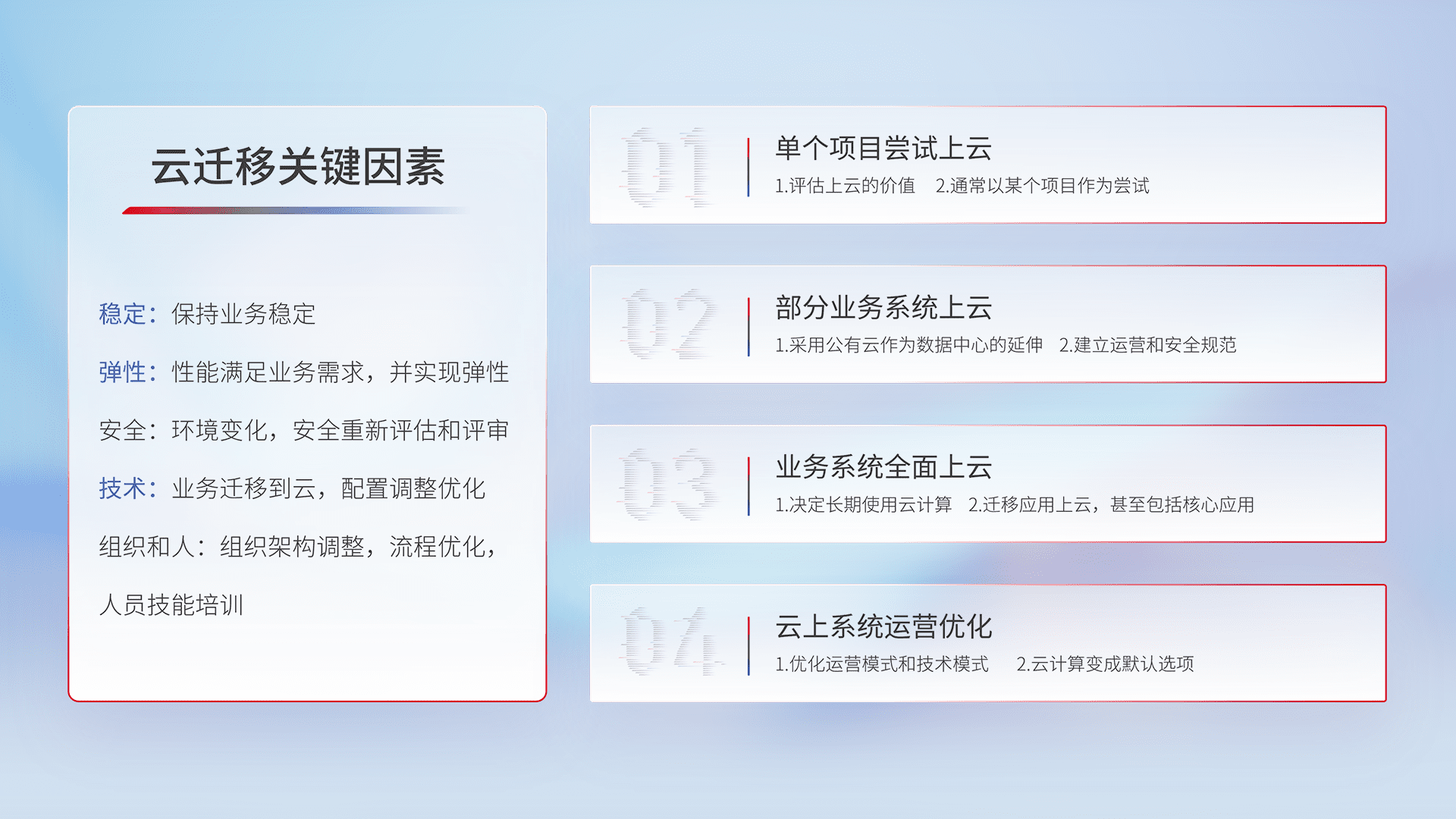 结合实际业务,,从规划设计、、、云平台选型、、、云原生改造、、、、数据迁移、、集成交付,,,迁移全过程为客户识别最佳上云路径,,,做好风险识别管理,,设计网络架构、、、身份权限、、、安全审计合规、、、操作审计、、、、日志审计、、、监控告警策略、、、、多站点容灾设计等,,,,对云上基础设施进行整体规划,,提升IT治理水平,,以满足弹性、、高可用、、、高性能的需求。。。。