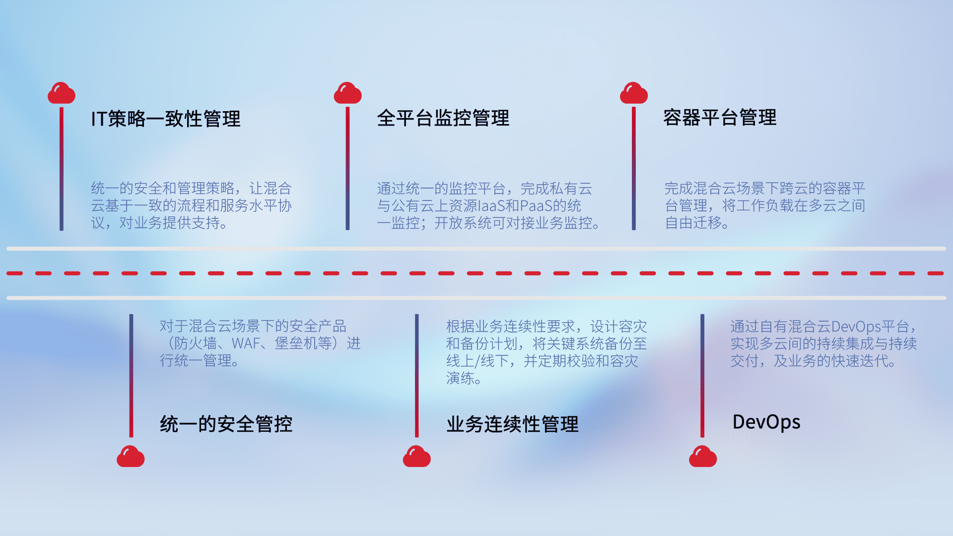 通过多云纳管,,以统一的资源数据模型把客户的云资源进行抽象和封装,,进而实现对多云资源的统一操作,,保障云资源管理的可靠性、、、稳定性与可用性。。量身定制化运维内容,,,,配置、、、、开发运维、、、、补丁管理、、、备份、、监控、、、认证和访问管理、、、审计和日常巡检等,,保障在用云过程中的可靠度,,稳定度以及高可用率。。