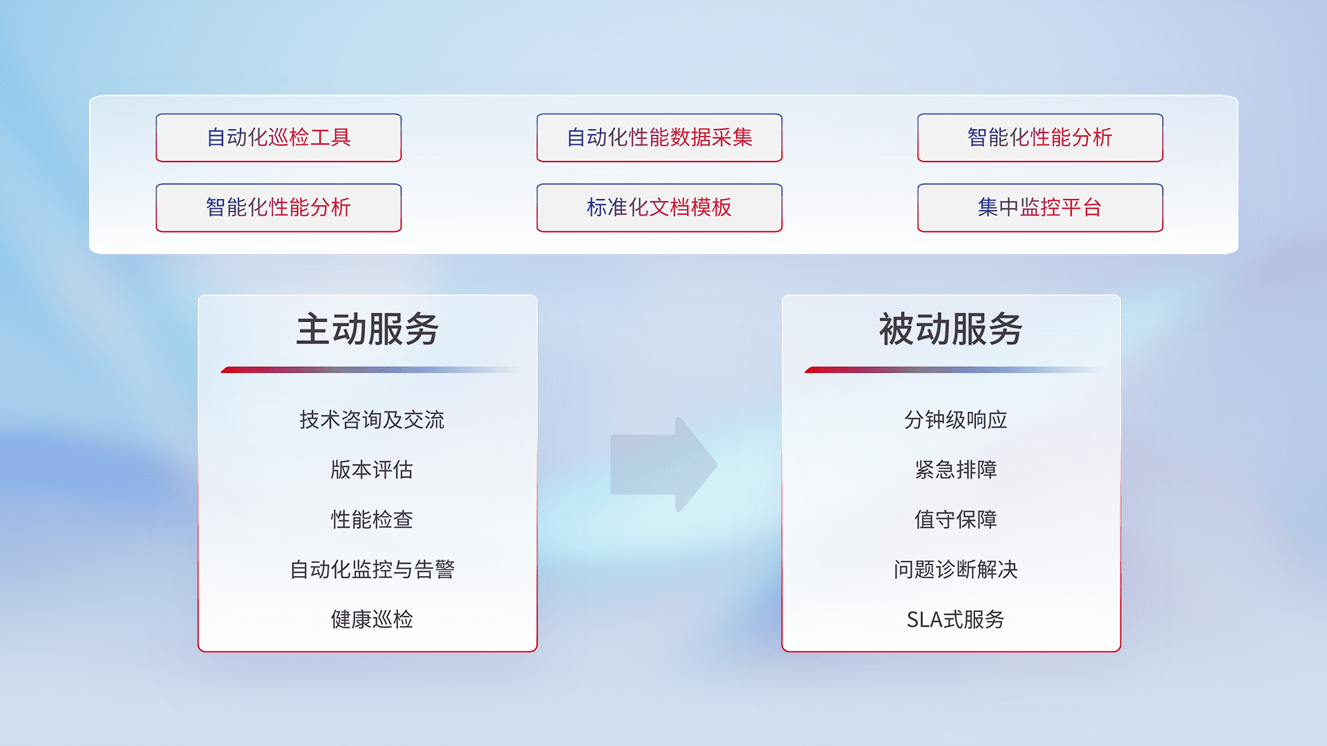 智能化工具和标准化文档,,,保障服务质量,,,,提供主动服务(包含技术咨询、、、版本评估、、、、性能检查、、、自动化监控与告警、、、健康巡检)和被动服务包含(分钟级响应、、紧急排障、、值守保障、、、问题诊断解决、、SLA服务)。。。。