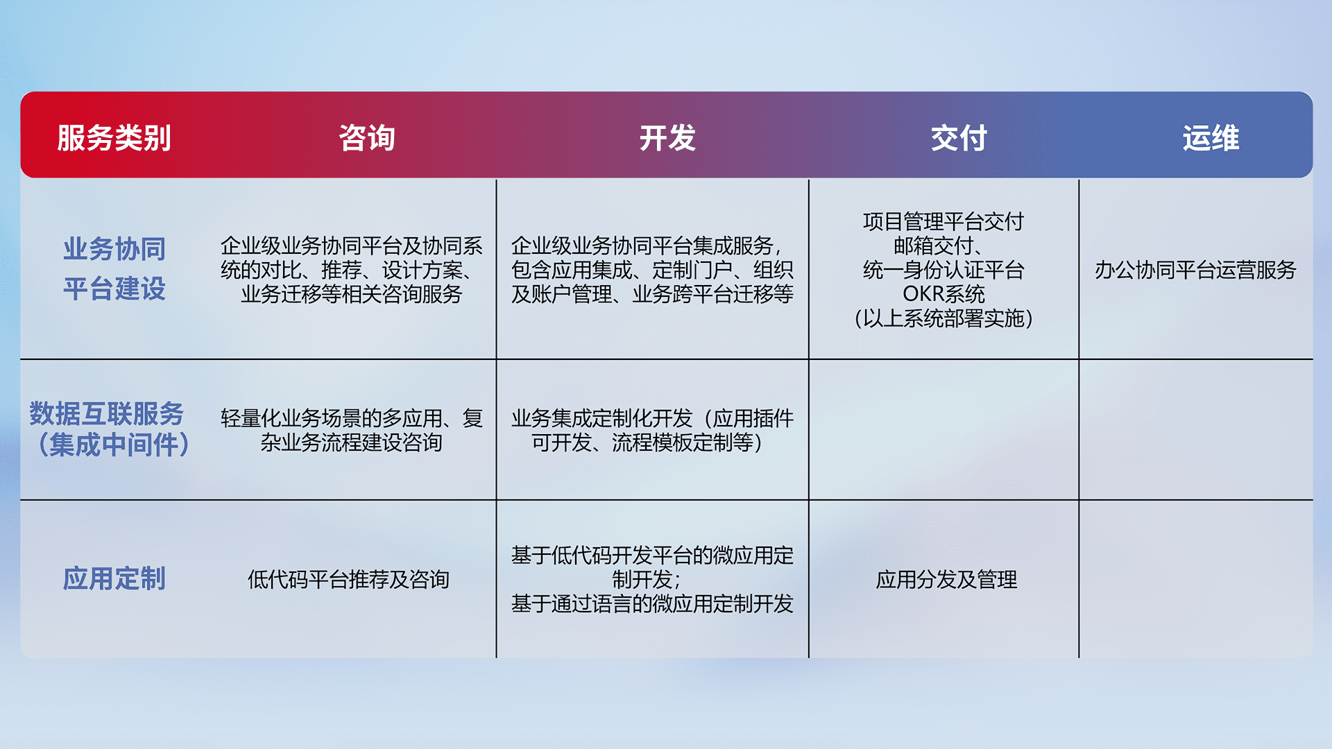 针对钉钉、、企微、、、、IDaas等平台级产品提供产品的规划、、、方案、、、、交付、、、、定制化开发等服务,,实现如统一协同办公、、、、智能客户服务、、、混合会议管理、、、、智能数据查询、、等业务场景,,实现数字化转型。。。